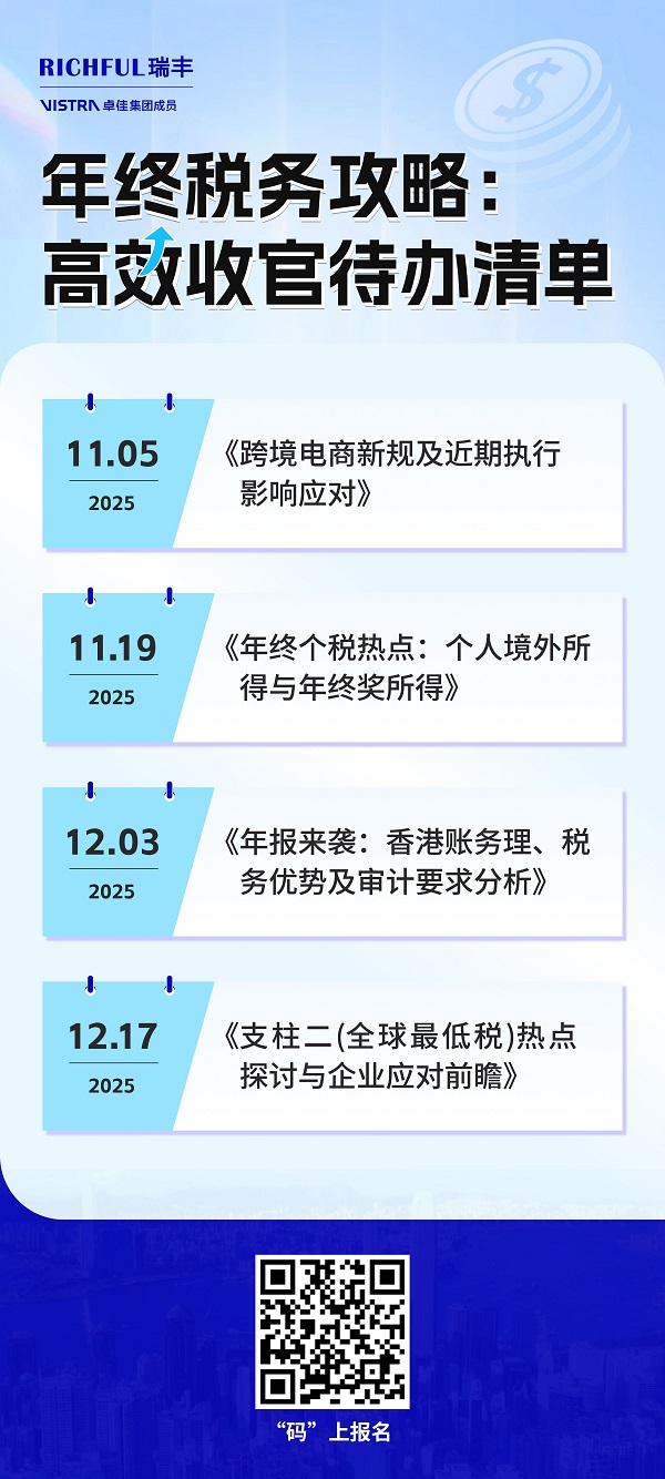 歲末將至,面對(duì)紛繁復(fù)雜的稅務(wù)政策與緊迫的年度收官工作,您是否正在尋求一份清晰高效的行動(dòng)指南?我們精心策劃 “年終稅務(wù)攻略:高效收官待辦清單”系列網(wǎng)絡(luò)研討會(huì),直擊四大關(guān)鍵議題,助您系統(tǒng)梳理合規(guī)路徑,優(yōu)化財(cái)稅布局,為2025年的穩(wěn)健發(fā)展奠定堅(jiān)實(shí)基礎(chǔ)。