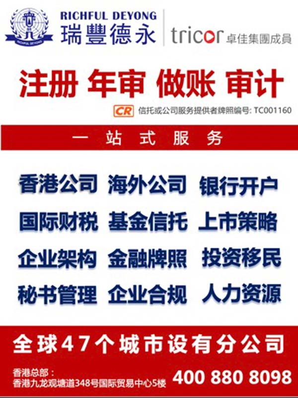 服務(wù)涵蓋:上市公司秘書(shū)、新股上市及股票登記、債務(wù)托管及授信,財(cái)富管理,海外信托和基金會(huì)設(shè)立,香港及離岸公司注冊(cè),特許牌照申請(qǐng),企業(yè)架構(gòu),財(cái)稅咨詢,會(huì)計(jì)安排,人力資源、薪酬管理,綜合性商務(wù)、企業(yè)及投資者服務(wù)等領(lǐng)域。瑞豐德永秉持“全球化運(yùn)營(yíng),國(guó)際化標(biāo)準(zhǔn),致力于每一位客戶的滿意和成功”的服務(wù)宗旨,務(wù)實(shí)為中國(guó)企業(yè)國(guó)際化發(fā)展拓展價(jià)值版圖,是您值得信賴的合作伙伴!