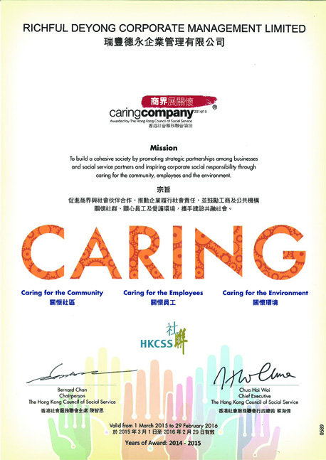 香港社會服務聯會頒發「商界展關懷」標志證書