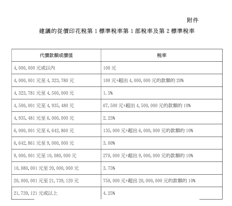 買賣或轉(zhuǎn)讓住宅或非住宅物業(yè)的文書須按物業(yè)售價或價值(以較高者為準(zhǔn))繳付從價印花稅。最低的從價印花稅稅率為一百元,適用于售價或價值為三百萬元或以下的物業(yè)。經(jīng)調(diào)整后,售價或價值為四百萬元或以下的物業(yè)須繳的從價印花稅一律為一百元。計及特別寬減后,預(yù)計調(diào)整將惠及約百分之十五的物業(yè)成交個案,政府收入每年減少約四億元。調(diào)整后的稅階見附件。新稅階適用于二零二五年二月二十六日或之后簽立的文書。