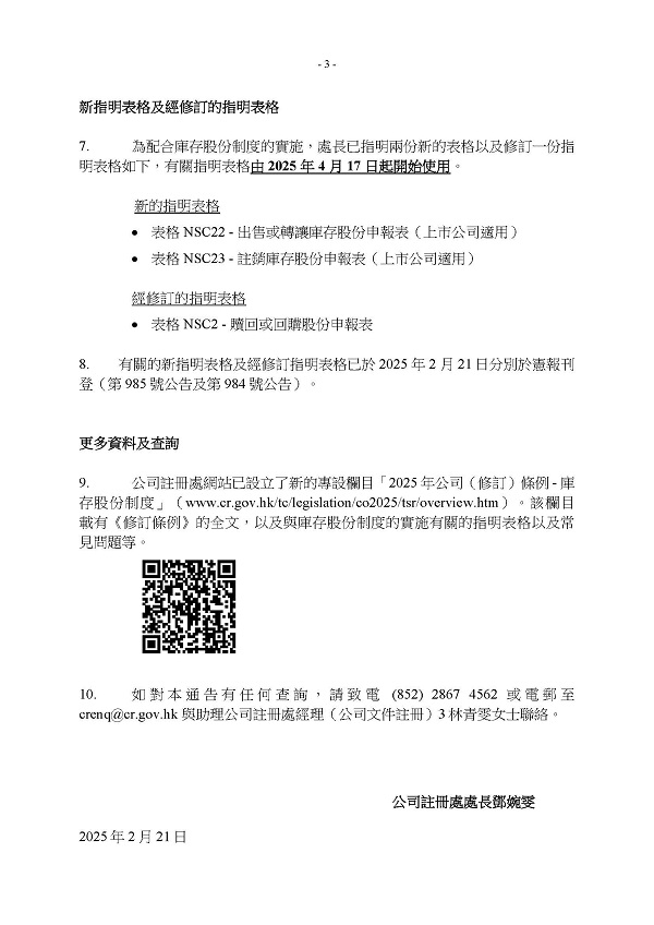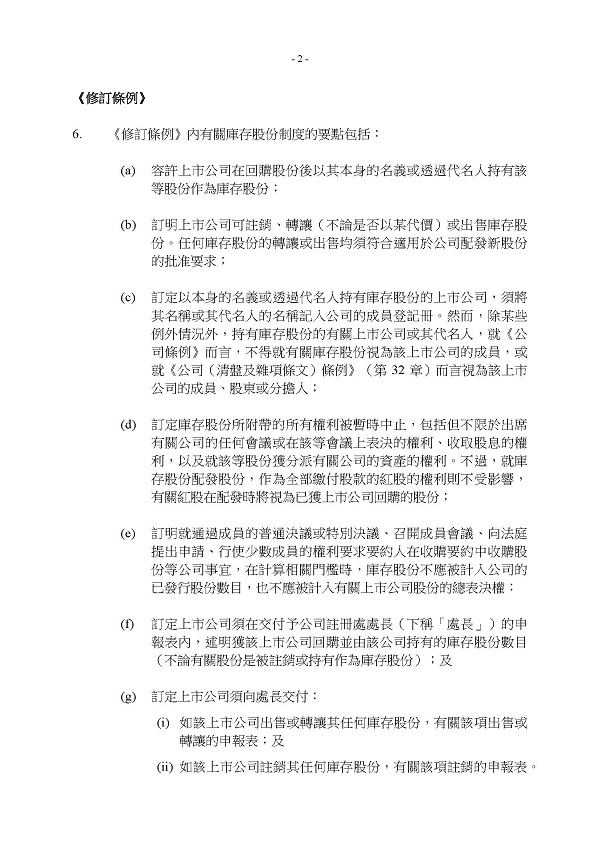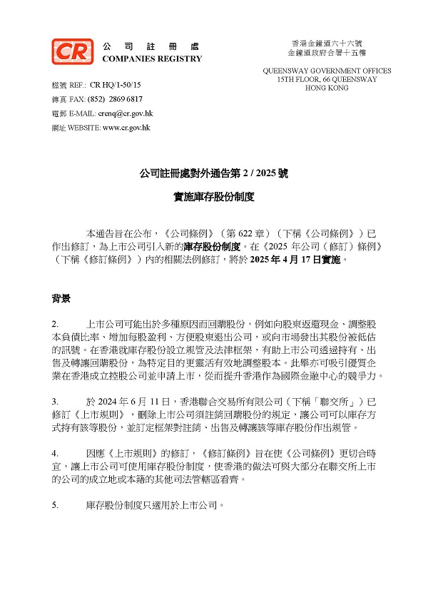 《公司條例》(第622章)已作出修訂,為上市公司引入新的庫存股份制度,讓上市公司可以庫存方式持有和處置回購的股份。在《2025年公司(修訂)條例》內的相關法例修訂,將于2025年4月17日實施。