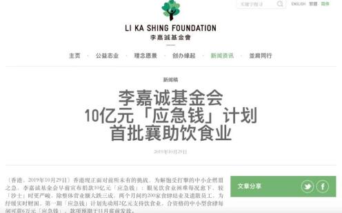 同一天,李嘉誠基金會發布聲明:香港現正面對前所未有的挑戰,為解飽受打擊的中小企燃眉之急,基金會此前宣布捐款10億元“應急錢”。