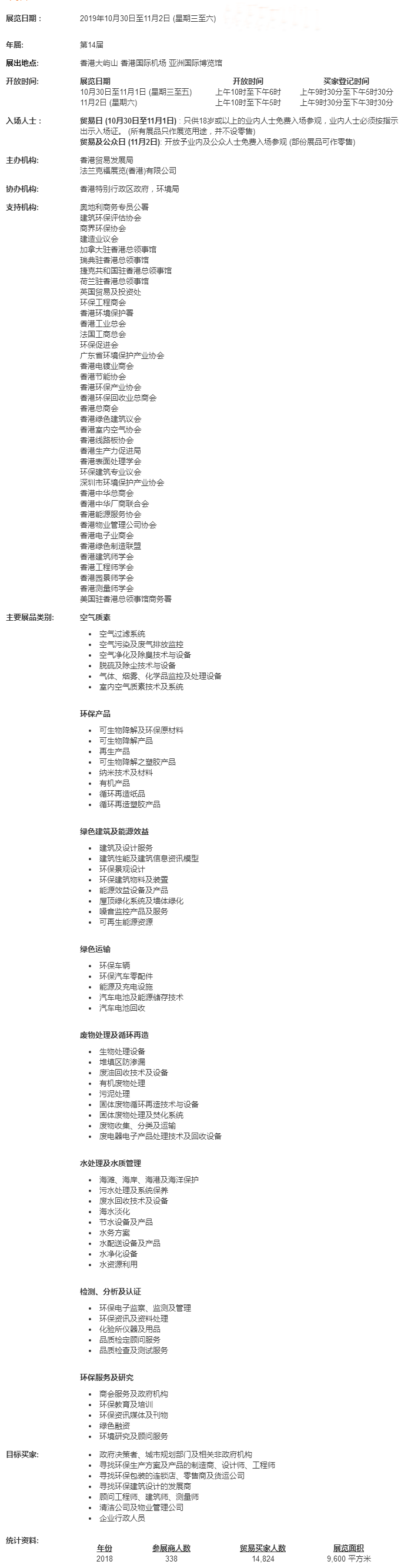國際環保博覽是亞洲環保行業的優質商貿平臺,展示最新的環保產品、設備和先進技術。博覽由香港特區政府環境局協辦,通過香港、中國內地及國際政府部門和行業商會的鼎力支持,為環保行業提供企業對政府(B2G)和企業對企業(B2B)層面的商機。