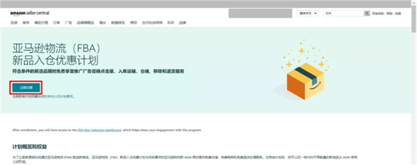 (1)登陸亞馬遜賣家平臺,訪問該計劃活動頁,點擊頁面中的“立即注冊”按鈕,即可加入該計劃。您發(fā)送商品到亞馬遜運營中心之前,必須先注冊該計劃,才有機會享受計劃中的費用優(yōu)惠。