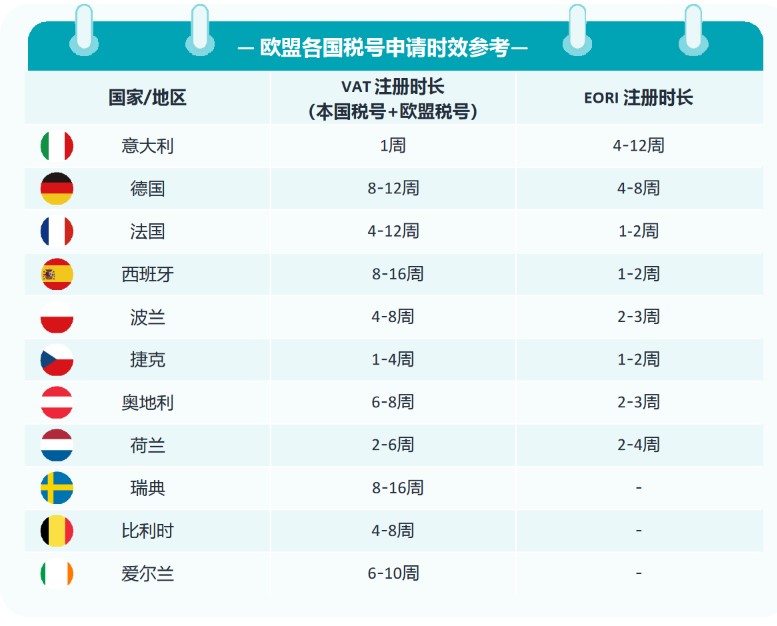 答:歐盟各國增值稅稅號注冊時長不一(請見下方“歐盟各國稅號申請時效參考”)