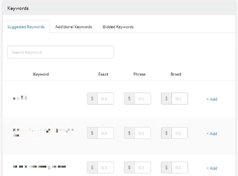②選擇自己的關鍵字并為每個關鍵字選擇匹配類型(完全匹配、詞組匹配或廣泛匹配)