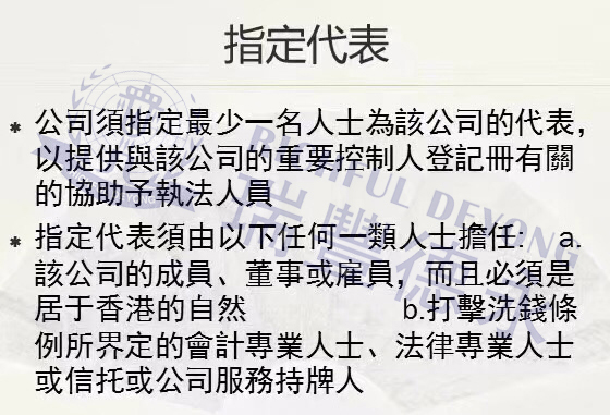 這里需要重點關注一下“公司指定代表”的幾個重要條件,現在市場很多小的香港公司注冊中介和代理可能無法達到上述要求,因此在辦理“備存重要控制人登記冊”的時候,一定要找符合條件和資質的機構來做,否則可能出現錢花了事情未辦妥的情況。