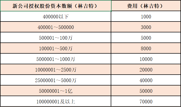 公司設立的費用將根據新公司擬授權的不同股份資本數量按照下述表格而收取固定費用: