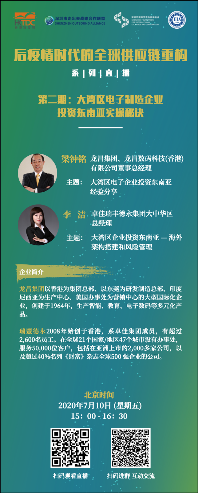 第二期直播將聚焦“大灣區電子制造企業投資東南亞實操秘笈”,將更進一步深入探討,活動邀請了在大灣區和東南亞都有投資設廠的電子企業,分享他們在東南亞投資的經驗和心得體會,并邀請權威專業機構從第三方角度進行點評,為大灣區電子企業在東南亞投資設廠提出建議。